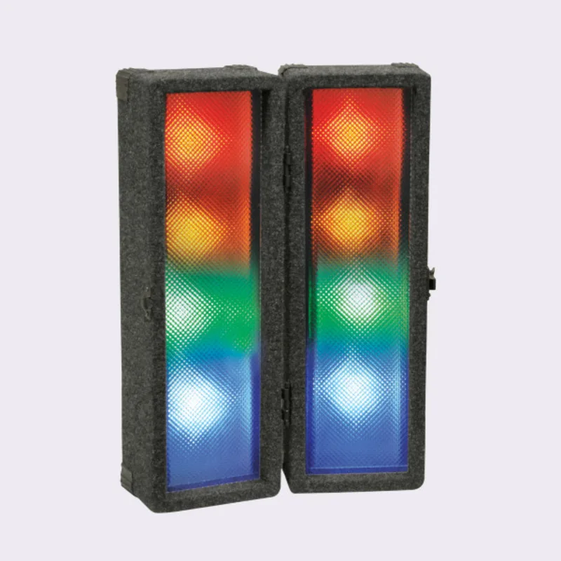 These clip-together retro spot Boxes have 4 ultra-bright LEDs per side and a built-in sound-to-light controller. The lightbox boasts 8 high-intensity long-life coloured LEDs (2 x Red, 2 x Amber, 2 x Green and 2 x Blue). Featuring controls for sound level and chase speed with prismatic screens to diffuse the light and give a retro disco look. The LED Light Box needs just a connection to the mains to work out of the box and provides a varied and interesting none smoke based effect. Finished for durability in a tough, rugged carpet covering with plastic corners, metal hinges, and a sturdy catch. The two sides clip together after use for safe and easy transportation. Mains Lead Length 1.3m, Connecting Lead length 5m.